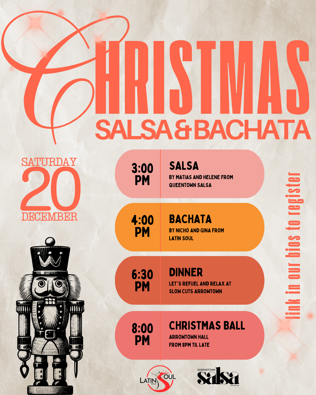 You’re invited to our end-of-year Salsa Christmas Party — a full afternoon + night of rhythm, connection, and holiday magic. Come learn, laugh, dance, and celebrate with the Queenstown Salsa and Latin Soul crew. No partner needed, just your Christmas spirit (and your best Xmas costume).